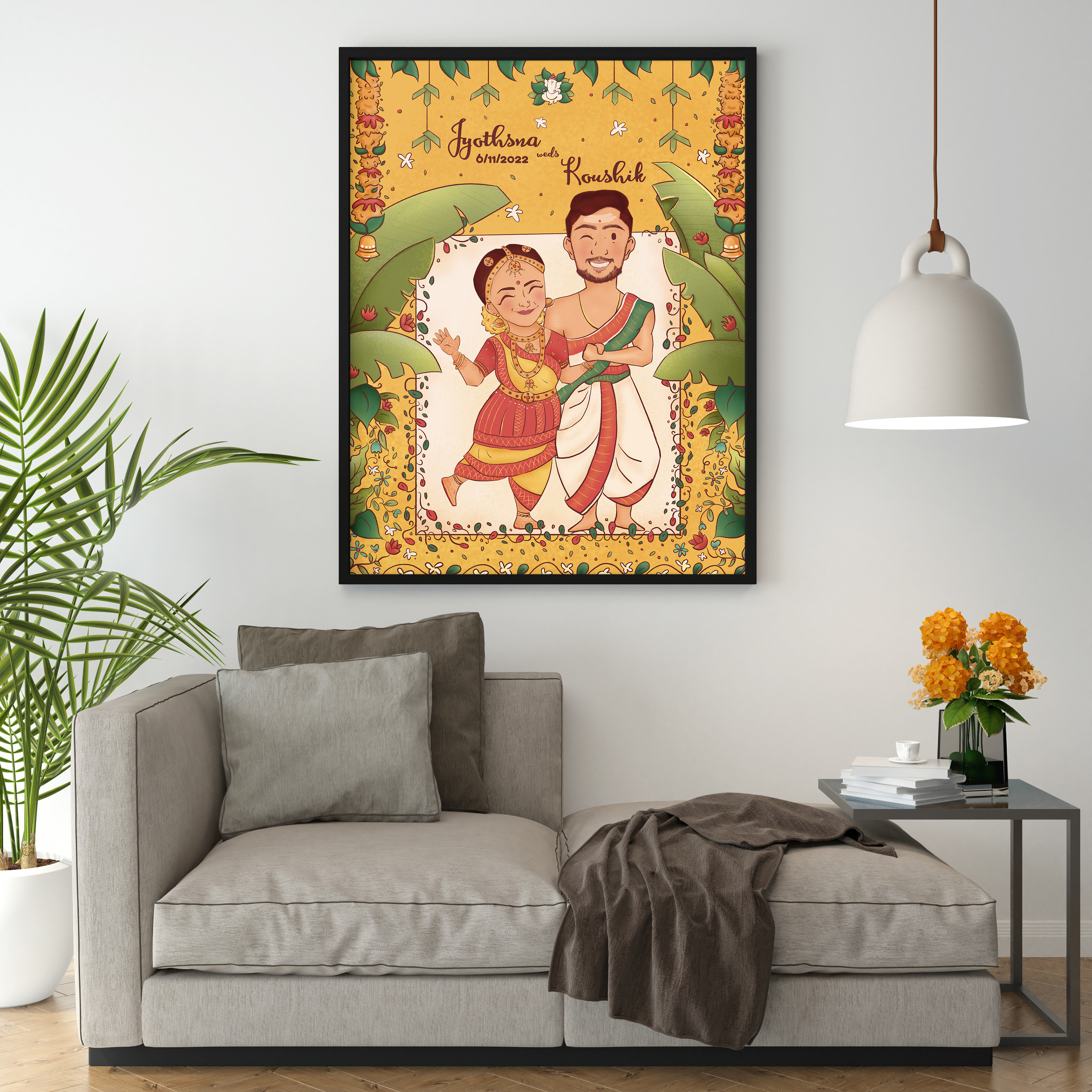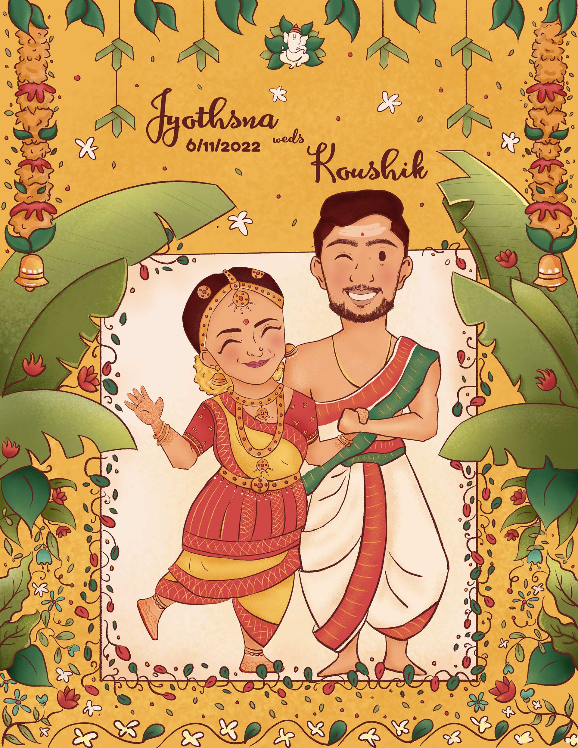 This invitation is designed for a south India bride and groom. They wanted it to be quirky and all things colorful!