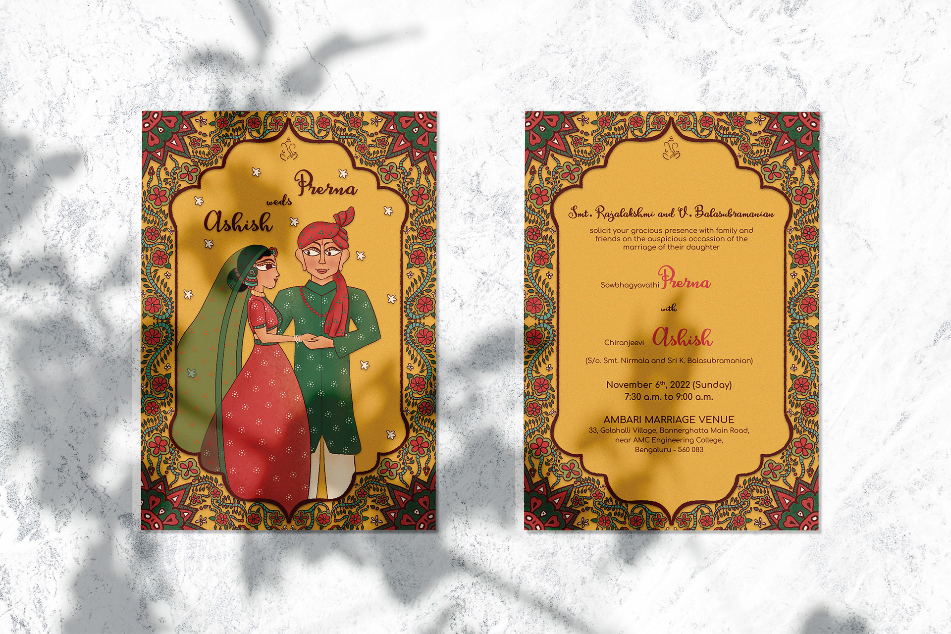 This invitation design is inspired by ancient Indian folk art Madhubani (also known as Mithila). This art style originated in the Mithila region of Bihar. Mithila paintings mostly depict people and their association with nature and scenes and deities from the ancient epics. Here we have used a contemporary version of the art form for the most important event of life.